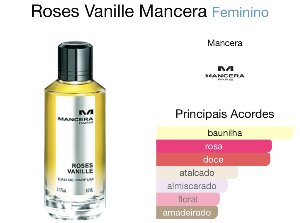 Roses Vanille de Mancera é um perfume Âmbar Baunilha Feminino. Roses Vanille foi lançada em 2011. O perfumista que assina esta fragrância é Pierre Montale. As notas de topo são: Limão e Notas Aquáticas. As notas de coração são: Rosa e Açúcar. As notas de fundo são: Baunilha, Açúcar, Almíscar Branco e Cedro.